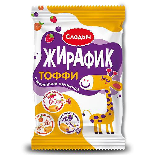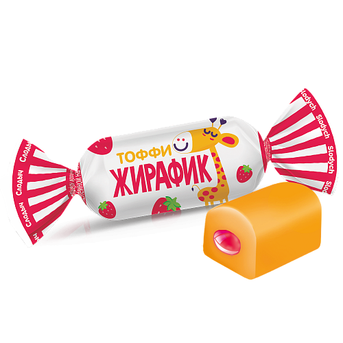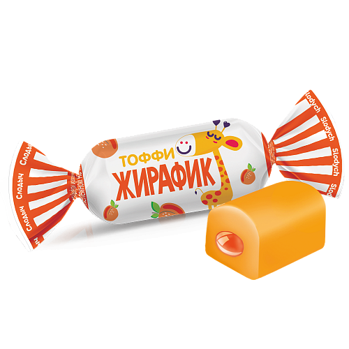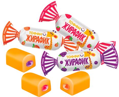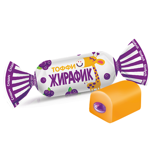 Конфеты "Жирафик" - это мягкий ирис, типа тоффи, с желейной начинкой: персик, клубника, черника.