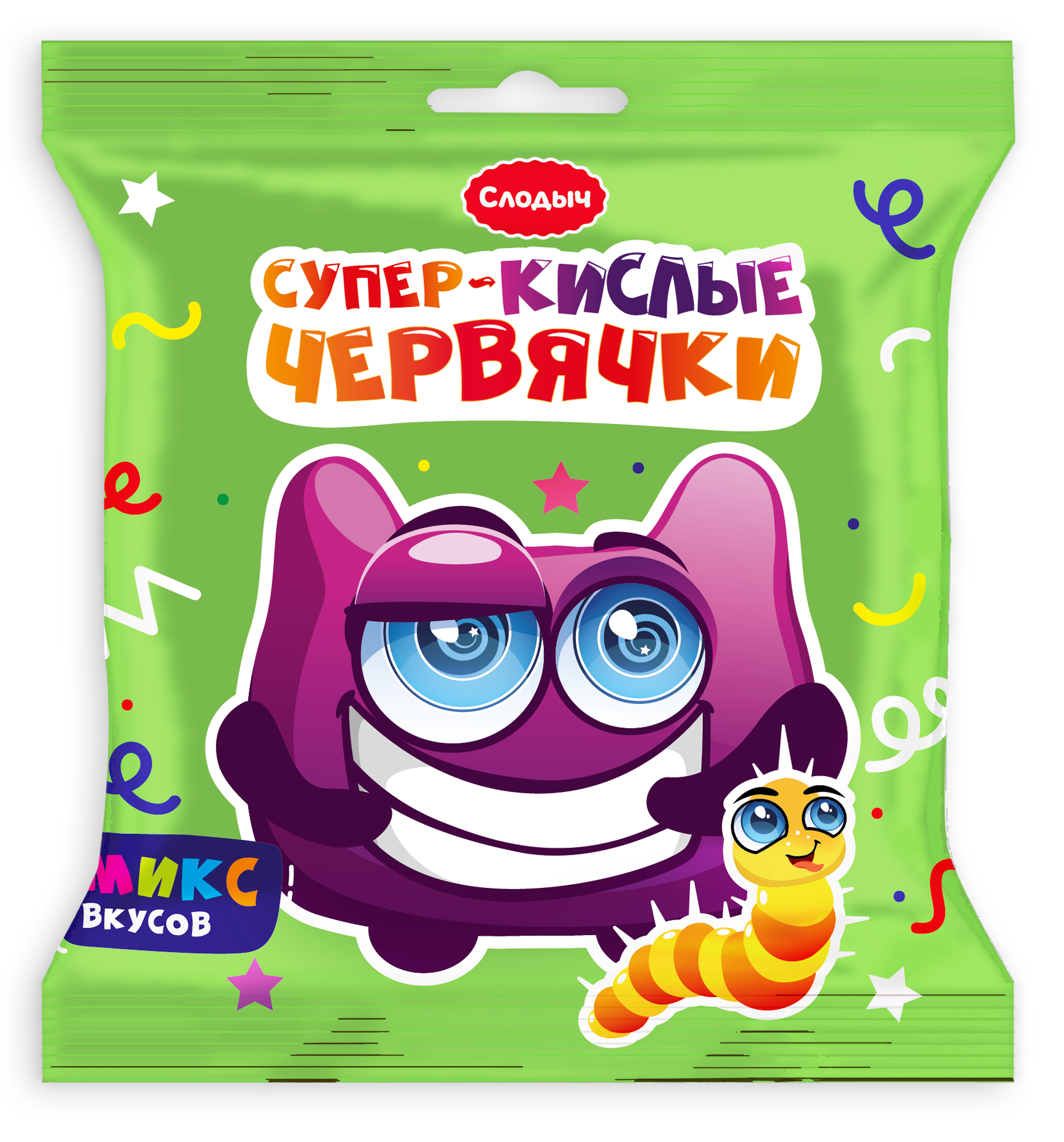 Желейные конфеты в форме червячков в кислой обсыпке со вкусом вишни, лайма, черной смородины и персика.