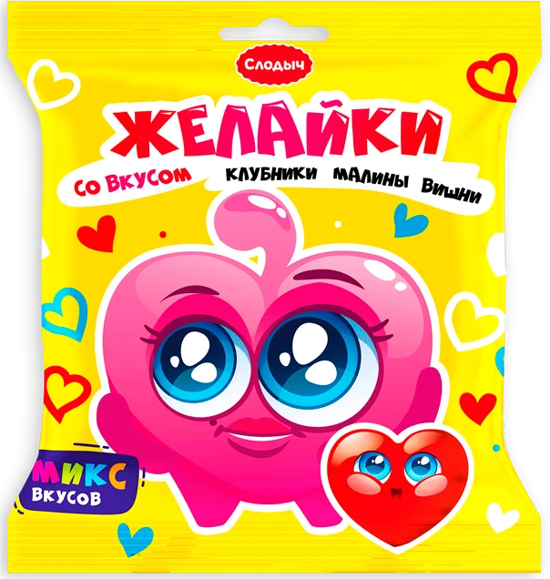 Конфеты в форме сердечек со вкусом клубники, малины и вишни.