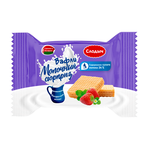 В вафлях "Молочный сюрприз" с ароматом клубники, повышенное содержание сухого молока – 24%!