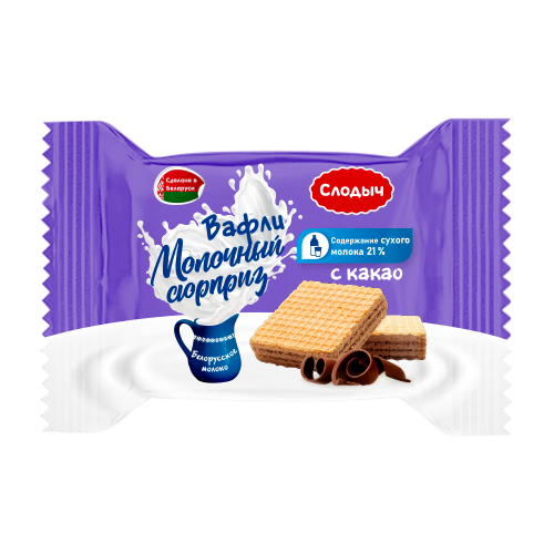 В вафлях "Молочный сюрприз" с какао, повышенное содержание сухого молока – 21%!
