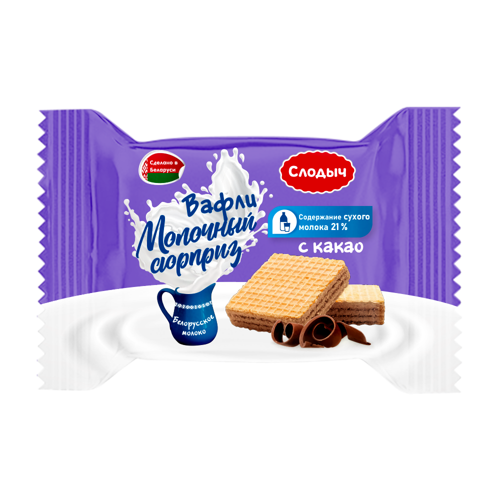 В вафлях "Молочный сюрприз" с ароматом клубники, повышенное содержание сухого молока – 24%!